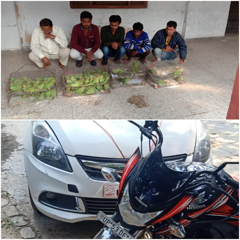 एसटीएफ उत्तर प्रदेश को प्रतिबन्धित पंक्षीयों की तस्करी करने वाले गैंग के विरूद्ध कार्रवाई करते हुए इस व्यापार में शामिल 6 अन्तर्राट्रीय तस्करों को नौसढ़ चैराहा जनपद गोरखपुर से गिरफ्तार करते हुए, विभिन्न प्रजातियों के 500 प्रतिबन्धित तोते बरामद करने में सफलता हासिल हुई है। जिसमें बताया है कि अब्दुल सईद, अनीस अहमद, दिलषाद अहमद, इरसाद बहराईच निवासी, महिला सलमा व मोहम्मद अजमत उर्फ मुन्ना गोरखपुर निवासी हैं। जिनके कब्जे से 500 प्रतिबंन्धित तोते, 6 मोबाइल फोन, 630 रूपए की नगदी, 4 अदद आधार कार्ड, 4 वोटर कार्ड, 1 पैन कार्ड, 1 गाडी स्वीफ्ट डिजायर समेत 1 मोटर साइकिल बरामद की है। मिली जानकारी के मुताबिक, वन विभाग उत्तर प्रदेष व डब्लूसीसीबी (वाइल्ड लाइफ क्राइम कन्ट्रोल व्यूरो) ने पुलिस महानिरीक्षक ने एसटीएफ उत्तर प्रदेश को कई जनपदों में व्यापक स्तर पर प्रतिबन्धित पक्षियों की तस्करी के बाद बिक्री करने की सूचना पर कार्रवाई करने का अनुरोध किया गया था। जिसके बाद ही 1 अक्टूबर को प्रतिबन्धित पंक्षी मुनिया की अवैध तस्करी करने वाले एक तस्कर को प्रतिबन्धित पंक्षी के साथ लखनऊ से गिरफ्तार किया गया था। गिरफ्तार आरोपी ने पूछताछ में बताया कि प्रतिबन्धित पंक्षी गोरखपुर के रास्ते बिहार होते हुए नेपाल भेजे जाते हैं। मुखबिर की सूचना पर बताया कुछ तस्कर प्रतिबंन्धित तोतों को बहराइच से गोरखपुर लाने वाले हैं। इस सूचना पर एसटीएफ व वन विभाग की संयुक्त टीम ने मुखबिर को साथ लेकर नौसढ़ चैराहा जनपद गोरखपुर के पास घेराबन्दी कर इन्तजार करने लगे। कुछ देर बाद एक मारूती स्वीफ्ट डिजायर गाड़ी यूपी-32 जीयू-3691 आती दिखाई दी, जिसे मुखबिर ने देखकर बताया कि यही वह गाड़ी है, जिसमें प्रतिबंन्धित तोतों की तस्करी हेतु ले जाया जा रहा है।