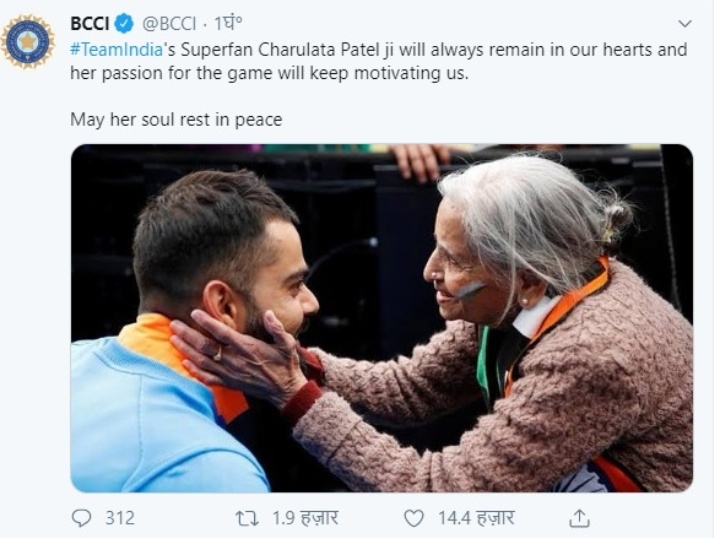 87 वर्षीय क्रिकेट फैन चारुलता पटेल का 13 जनवरी को शाम 5:30 बजे निधन हो गया।। इसकी जानकारी खुद बीसीसीआई ने दी है।