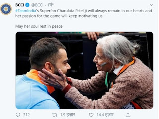 बीसीसीआई ने उन्हें श्रद्धांजलि देते हुए कहा कि टीम इंडिया की सुपरफैन चारुलता पटेल जी हमेशा हमारे दिलों में जिंदा रहेंगी और खेल के लिए उनका जुनून हमें प्रेरित करता रहेगा। उसकी आत्मा को शांति मिले।