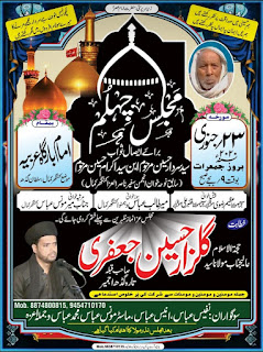 अम्बेडकरनगर के थाना सम्मनपुर क्षेत्र के कटघर कमाल में 23 जनवरी दिन गुरूवार को मरहूम सरदार हुसैन के चेहलुम की मजलिस 9 बजे अरबिया इमामबारगाह में शुरू होगी इस मजलिस को मौलाना गुलज़ार अजमेरी खेताब करेंगे.